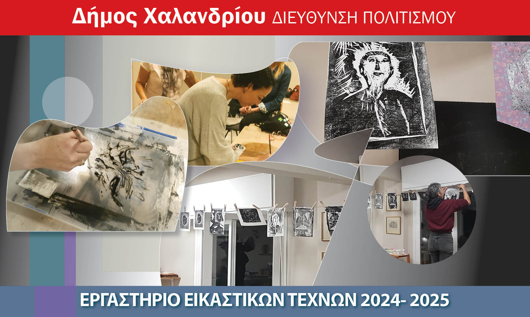 Το εργαστήριο εικαστικών τεχνών (σχέδιο, ζωγραφική, χαρακτική) του Δήμου Χαλανδρίου ξεκινά τη λειτουργία του την Τετάρτη 4 Δεκεμβρίου 2024. Οι ενδιαφερόμενοι/ες μπορούν να προχωρήσουν στην έγγραφή τους, για μια από τις 15 θέσεις, μέσω της πλατφόρμας: https://demos365.chalandri.gr/.