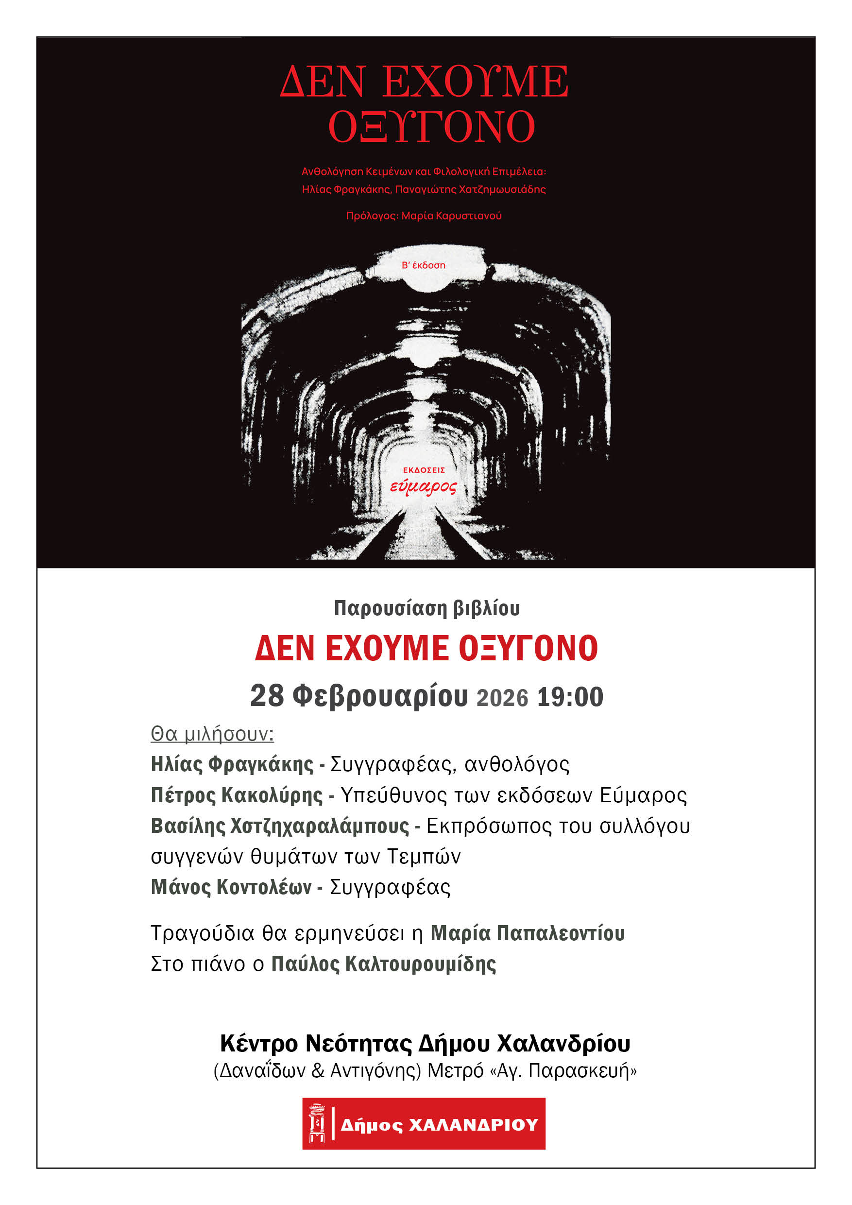 Το βιβλίο «Δεν έχουμε οξυγόνο» των εκδόσεων Εύμαρος παρουσιάζει ο Δήμος Χαλανδρίου το Σάββατο 28 Φεβρουαρίου, «μαύρη» επέτειο του σιδηροδρομικού δυστυχήματος στα Τέμπη, στις 19.00, στο Κέντρο Νεότητας (Δαναΐδων και Αντιγόνης).