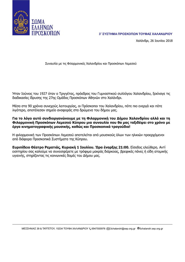 Με μια ενδιαφέρουσα συνεργασία ξεκινάει το Φεστιβάλ Ρεματιάς 2018. Στην πρώτη «Νύχτα Αλληλεγγύης» η Φιλαρμονική Ορχήστρα του Δήμου Χαλανδρίου με την Φιλαρμονική των Προσκόπων Λεμεσού μας ταξιδεύουν σε όλο τον κόσμο με υπέροχη κινηματογραφική μουσική. Συνθέσεις του Ένιο Μορικόνε ερμηνεύει η λυρική τραγουδίστρια Αννα Μορφίδη.