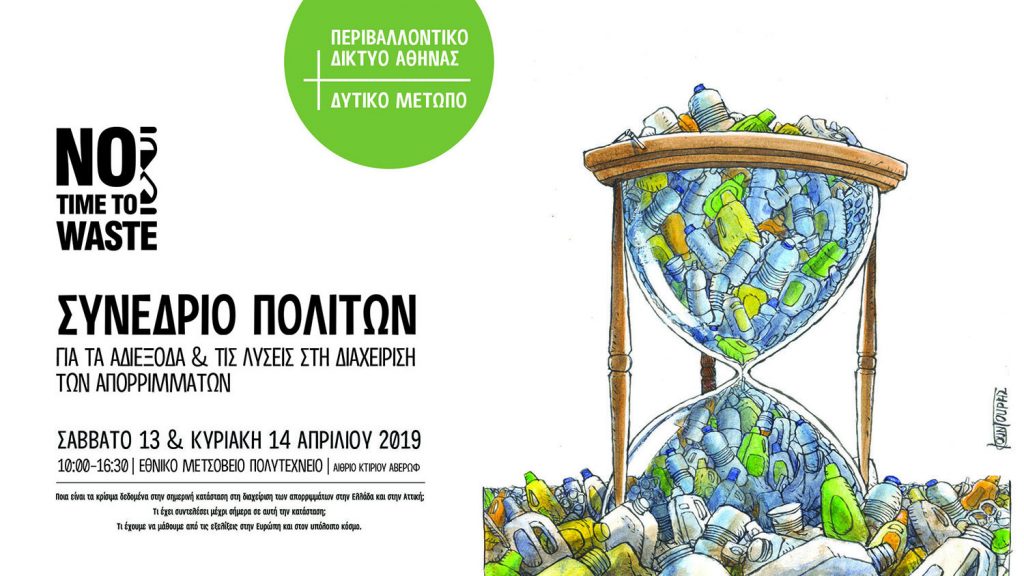 Με κεντρικό σύνθημα Nο time to WASTE – δεν υπάρχει καιρός για χάσιμο, πραγματοποιείται το Σάββατο 13 και Κυριακή 14 Απριλίου ώρες 10.00 – 16.00 στο χώρο της Αρχιτεκτονικής σχολής ΕΜΠ συνέδριο πολιτών για τα αδιέξοδα και τις λύσεις στη διαχείριση των απορριμμάτων. Η διοργάνωση πραγματοποιείται με την πρωτοβουλία και την υποστήριξη συλλογικοτήτων όπως το Δυτικό Μέτωπο, το Περιβαλλοντικό Δίκτυο και ενεργών πολιτών. Το συνέδριο διεξάγεται σε μια εξαιρετικά κρίσιμη για τη διαχείριση των απορριμμάτων χρονική στιγμή, καθώς ο ΧΥΤΑ Φυλής που υποδέχεται πάνω από το 90% των απορριμμάτων της Αττικής εξαντλείται μέσα στο 2019 και μια κρίση εκρηκτικών διαστάσεων είναι προ των πυλών.