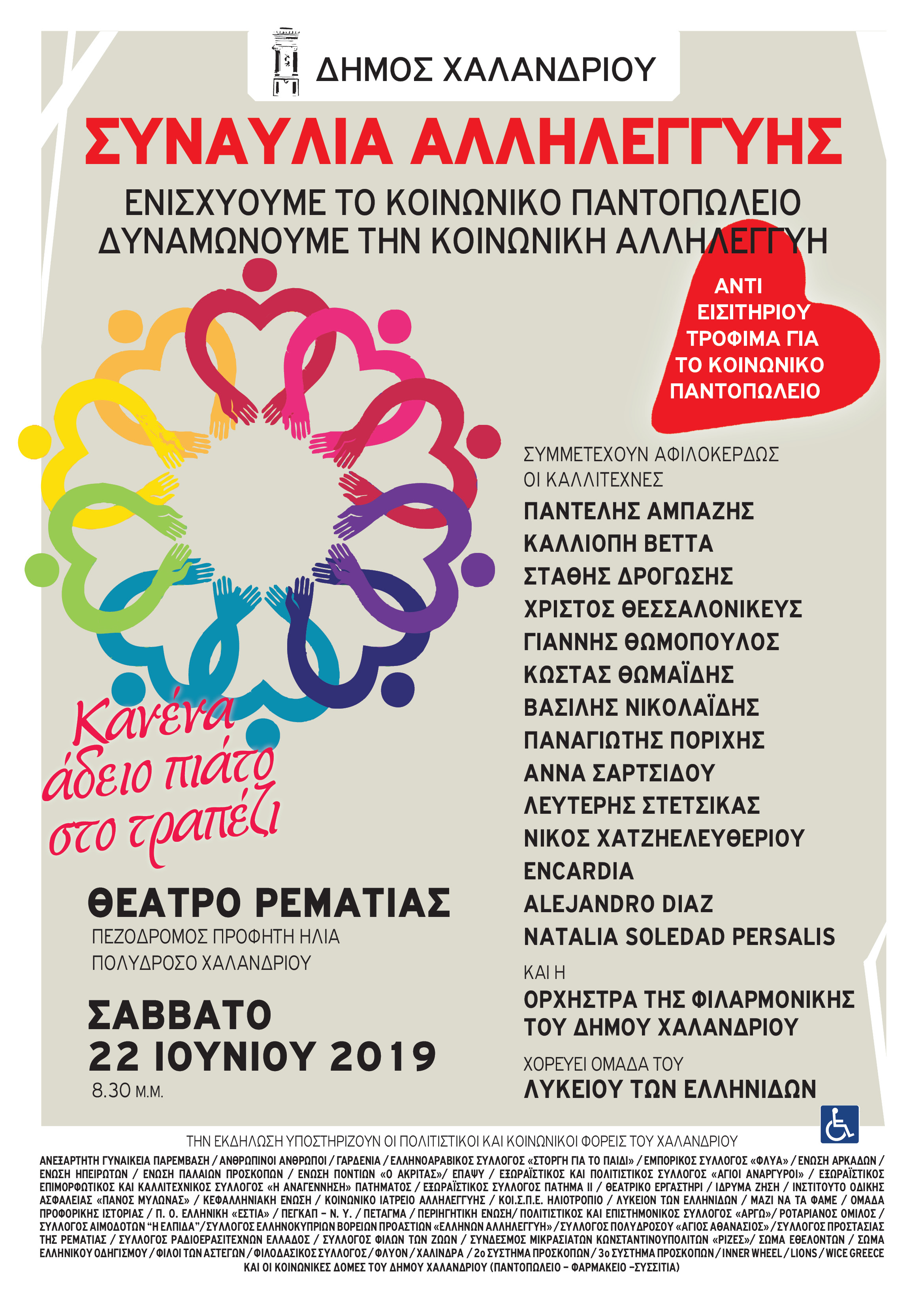 Με σύνθημα «ΚΑΝΕΝΑ ΑΔΕΙΟ ΠΙΑΤΟ ΣΤΟ ΤΡΑΠΕΖΙ» οργανώνεται για 4η συνεχή χρονιά η Συναυλία Αλληλεγγύης που έχει σκοπό την ενίσχυση του Κοινωνικού Παντοπωλείου Χαλανδρίου με την υποστήριξη 47 συλλογικών φορέων της πόλης.