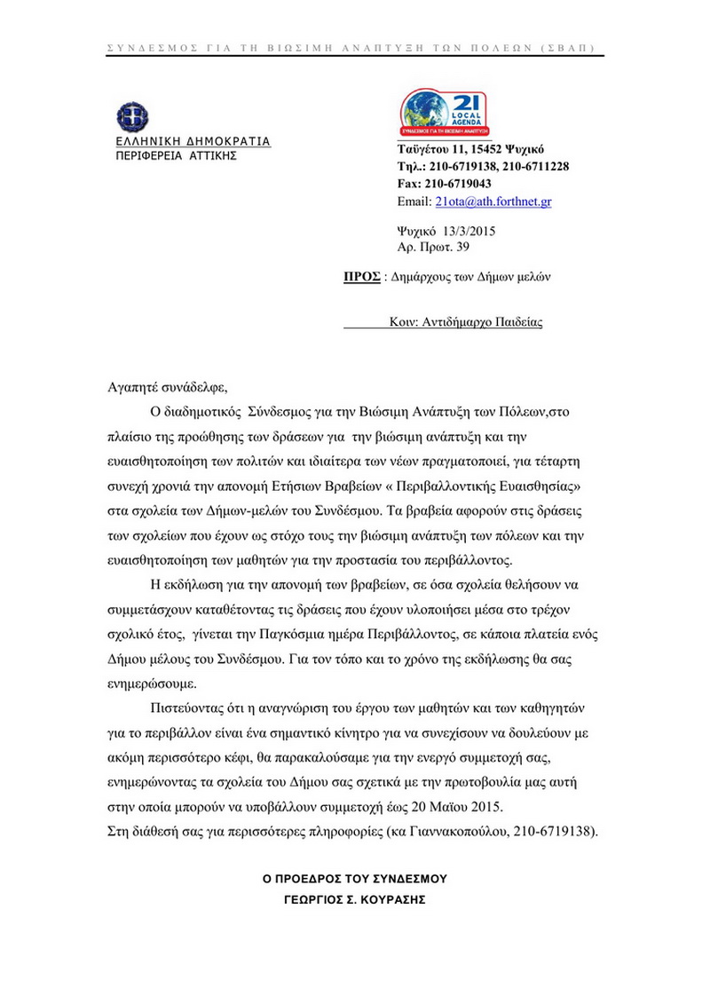 Ετήσια Βραβεία Περιβαλλοντικής Ευαισθησίας στα Σχολεία