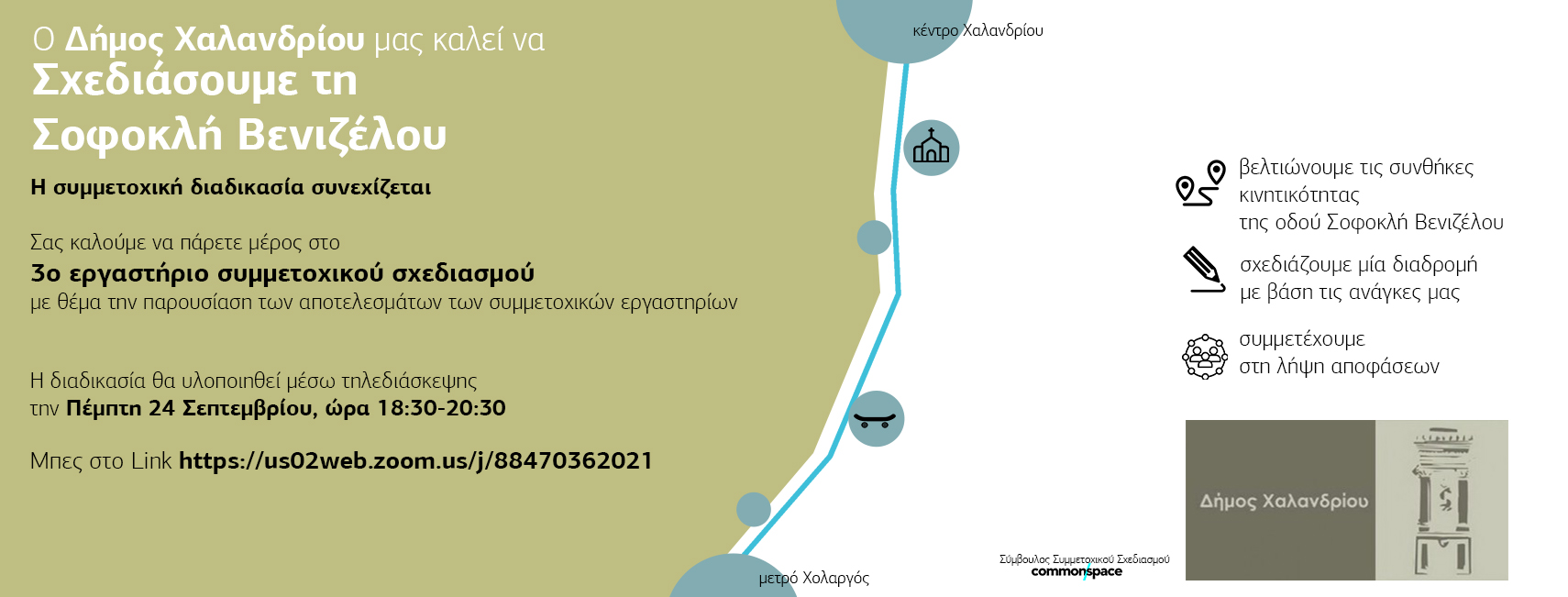 Προς την ολοκλήρωσή της βαίνει η διαδικασία του συμμετοχικού σχεδιασμού της βιώσιμης κινητικότητας της Σ. Βενιζέλου, στο Κάτω Χαλάνδρι. Την Πέμπτη 24 Σεπτεμβρίου 2020 από τις 18:30 έως τις 20:30 θα γίνει μέσω τηλεδιάσκεψης η παρουσίαση των αποτελεσμάτων των προηγούμενων εργαστηρίων για τη βιώσιμη κινητικότητα στη Σ. Βενιζέλου.