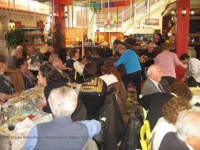Το εστιατόριο Νερόμυλος κατακλύστηκε από άνδρες και γυναίκες με αποκριάτικες στολές και πολλή διάθεση για γέλιο και διασκέδαση. Το σύνθημα έδωσε ο τραγουδιστής Παντελής Αμπαζής και ο χορός δε σταμάτησε για τρεις ώρες περίπου. Η διασκέδαση είχε και το απρόοπτο! Ένα μέλος του ΚΑΠΗ Κάτω Χαλανδρίου λιποθύμησε, όμως επανήλθε σύντομα με τις φροντίδες από τα έμπειρα στελέχη.
