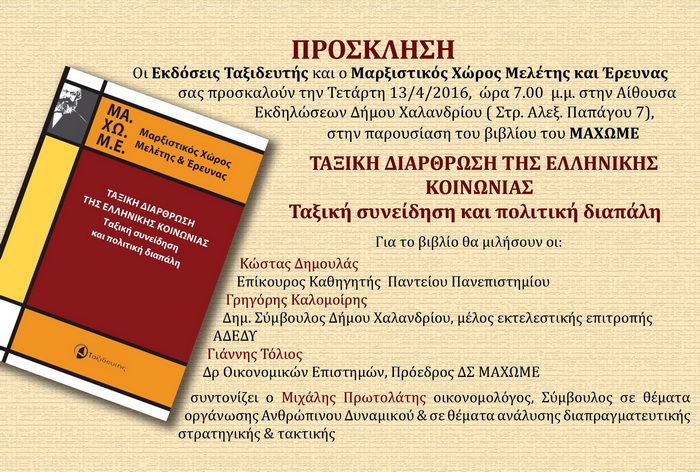 Παρουσίαση του νέου βιβλίου του ΜΑΧΩΜΕ που εκδόθηκε από τις εκδόσεις “ΤΑΞΙΔΕΥΤΗΣ” με θέμα: “Ταξική Διάρθρωση της Ελληνικής Κοινωνίας – Ταξική Συνείδηση και Πολιτική Διαπάλη“, την Τετάρτη 13 Απριλίου στην αίθουσα εκδηλώσεων του Δήμου Χαλανδρίου (Παπάγου 7).