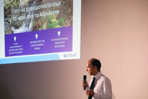 Ο αντιδήμαρχος Χαλανδρίου, Κώστας Γερολυμάτος, συντονιστής του ευρωπαϊκού προγράμματος Cultural H.ID.RA.N.T.-UIA, αναφέρθηκε στην αξία του εγχειρήματος ως συλλογική προσπάθεια – πρόκληση για την αλλαγή κουλτούρας και προτύπου στην σχέση των πολιτών και του δήμου με τους υδάτινους πόρους τους μέσα από τη συγκρότηση μίας αλληλέγγυας κοινότητας νερού. Μιας κοινότητας συναποτελούμενης από το Δήμο, την ΕΥΔΑΠ, τους χρήστες το Αδριάνειου νερού και τους κατοίκους του Χαλανδρίου που απαιτεί την δημιουργία ενός άλλου πλαισίου συμμετοχικότητας και συνεργασίας. Από την πλευρά του αναφέρθηκε στο τι μπορεί να προσφέρει ο Δήμος, όσων αφορά τη διανομή του μη-πόσιμου Αδριάνειου νερού στο Χαλάνδρι, αλλά και ως θεσμικός υποστηρικτής μίας αλληλέγγυας κοινότητας νερού.