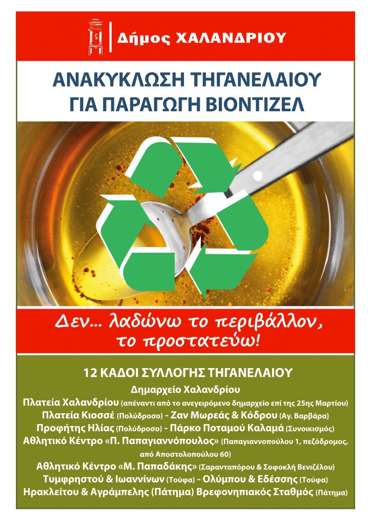 Σημειώνουμε ότι ο Δήμος Χαλανδρίου έχει δημιουργήσει ένα ακόμα ξεχωριστό ρεύμα ανακύκλωσης, για τη συλλογή, μεταφορά και ενεργειακή αξιοποίηση των χρησιμοποιημένων βρώσιμων λιπών & ελαίων (τηγανελαίων), για την παραγωγή βιοντίζελ, με την ανάπτυξη δικτύου ειδικών κάδων συλλογής.
