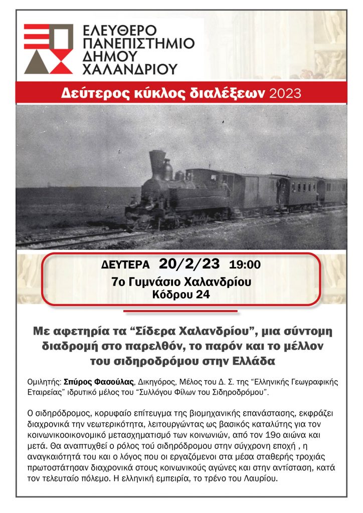 Με μια διάλεξη αφιερωμένη στο παρελθόν, το παρόν και το μέλλον του σιδηροδρόμου στην Ελλάδα ανοίγει ο κύκλος των διαλέξεων, για το Β’ τρίμηνο του έτους ’22 –’23, του Ελεύθερου Πανεπιστημίου Δήμου Χαλανδρίου.
